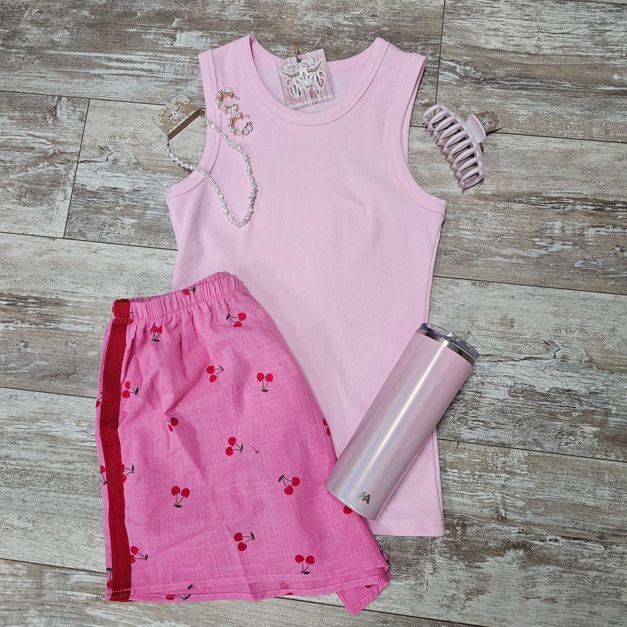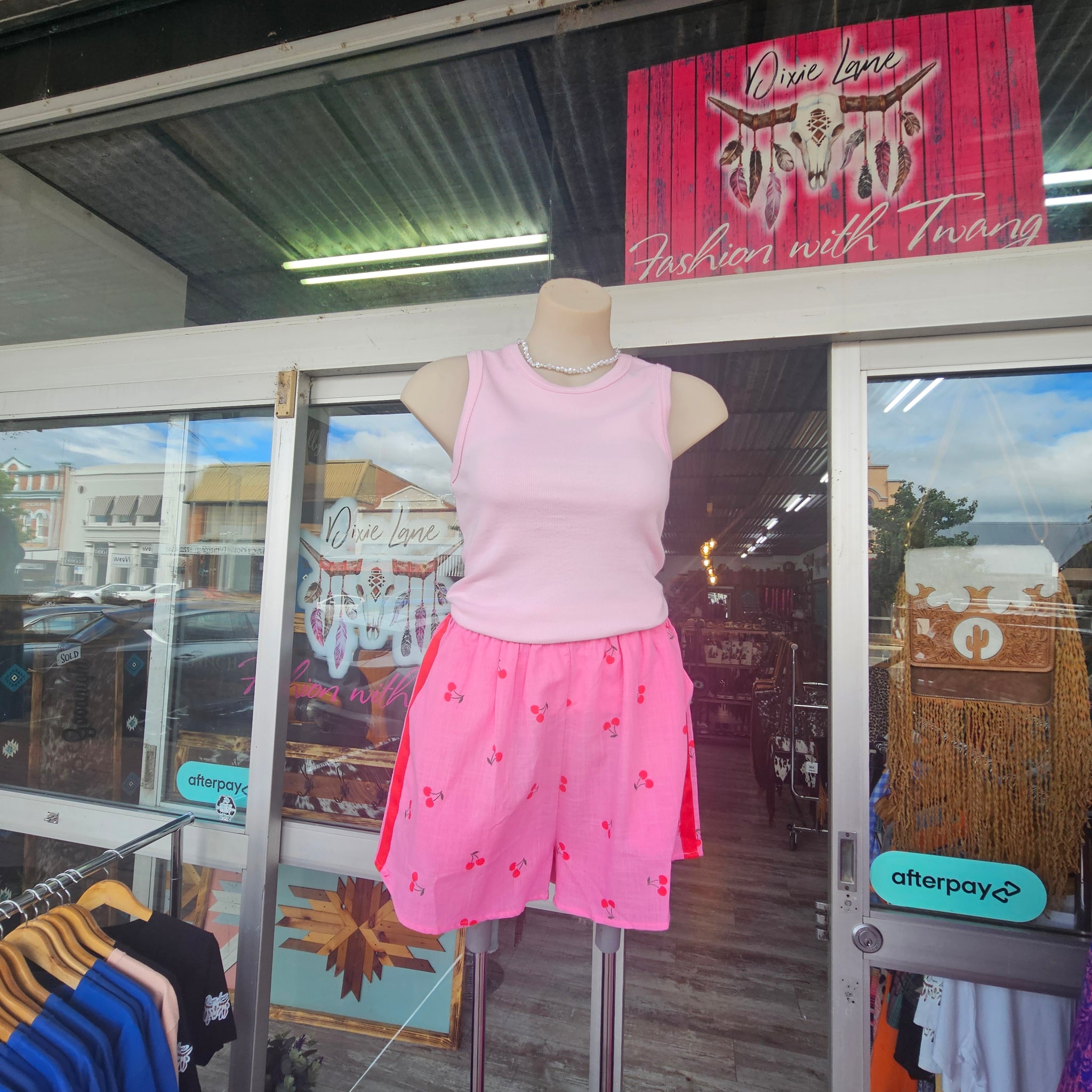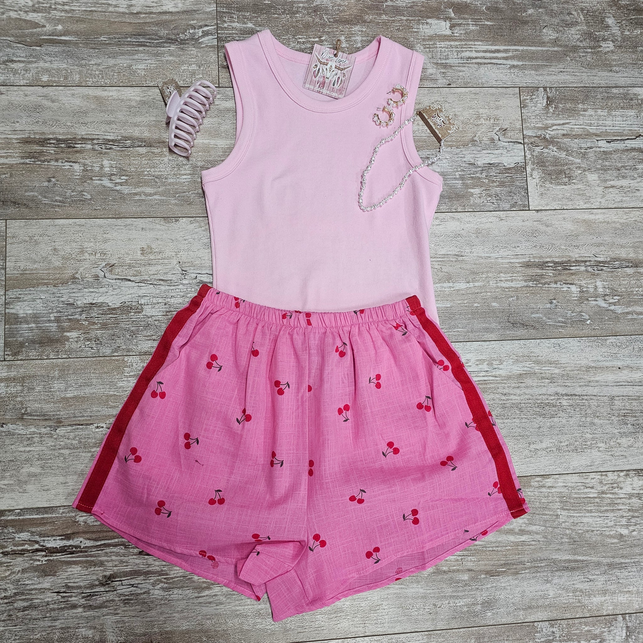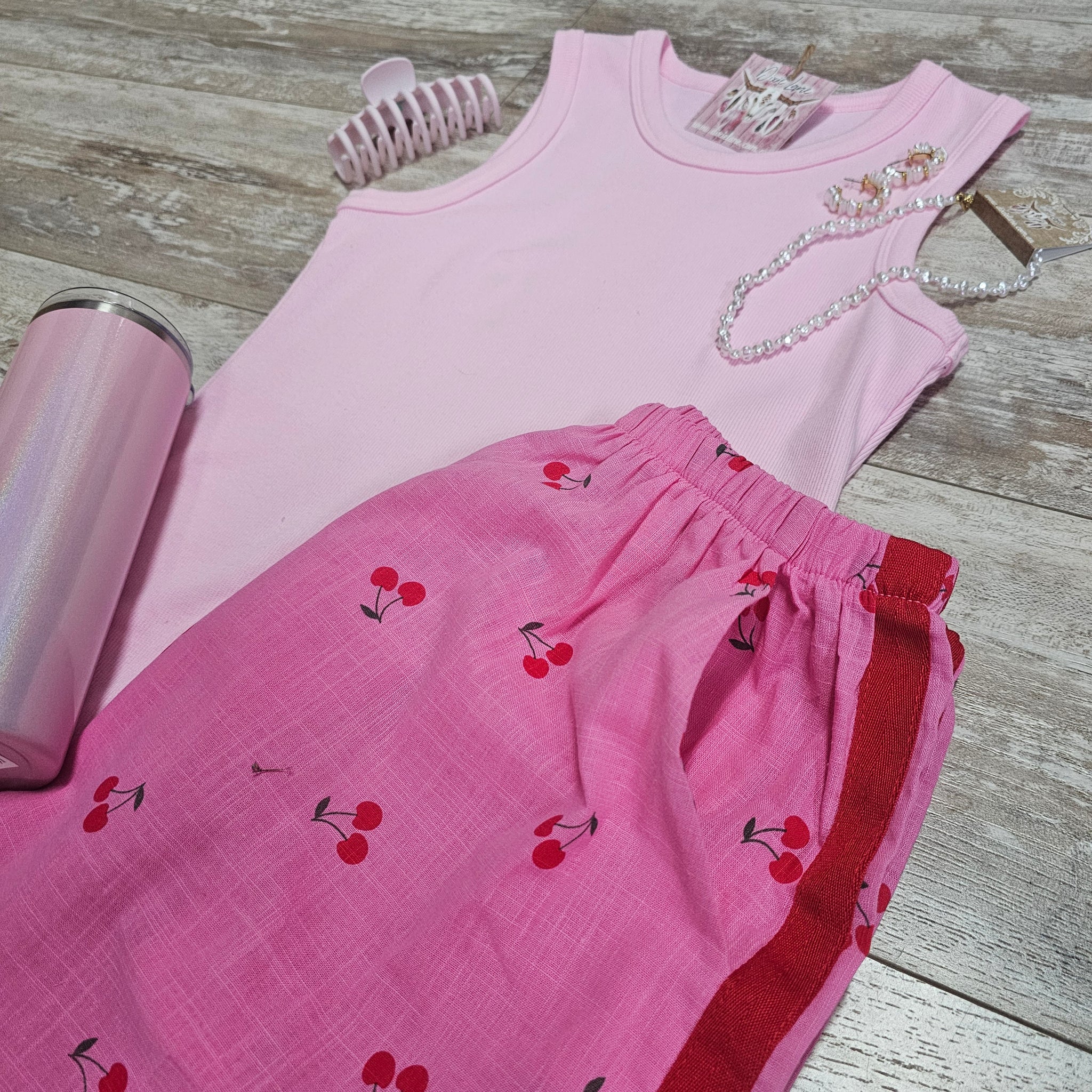 Made from 100% Cotton and a super cute cherry design paired with red side taping stripes they are both feminine & comfortable. Plus they of course have pockets!